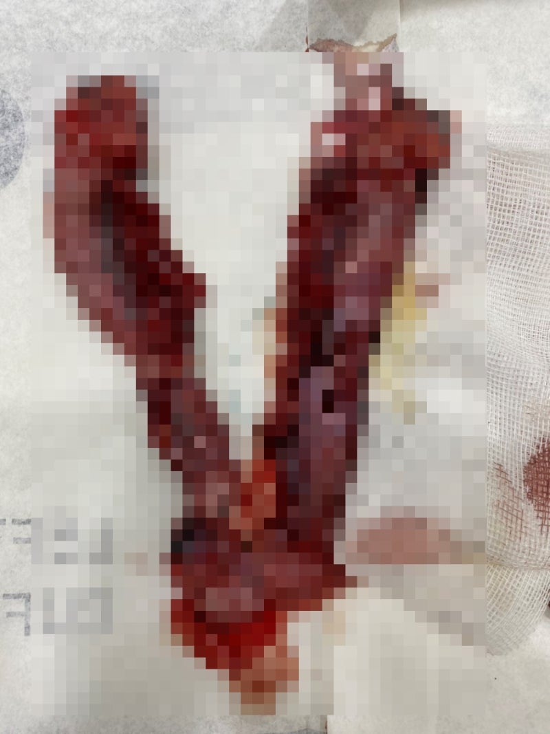 자궁축농증이 발생한 자궁이기 때문에 사진처럼 자궁이 얇지 않고 모양도 규칙적이지 않고 울퉁불퉁하죠?