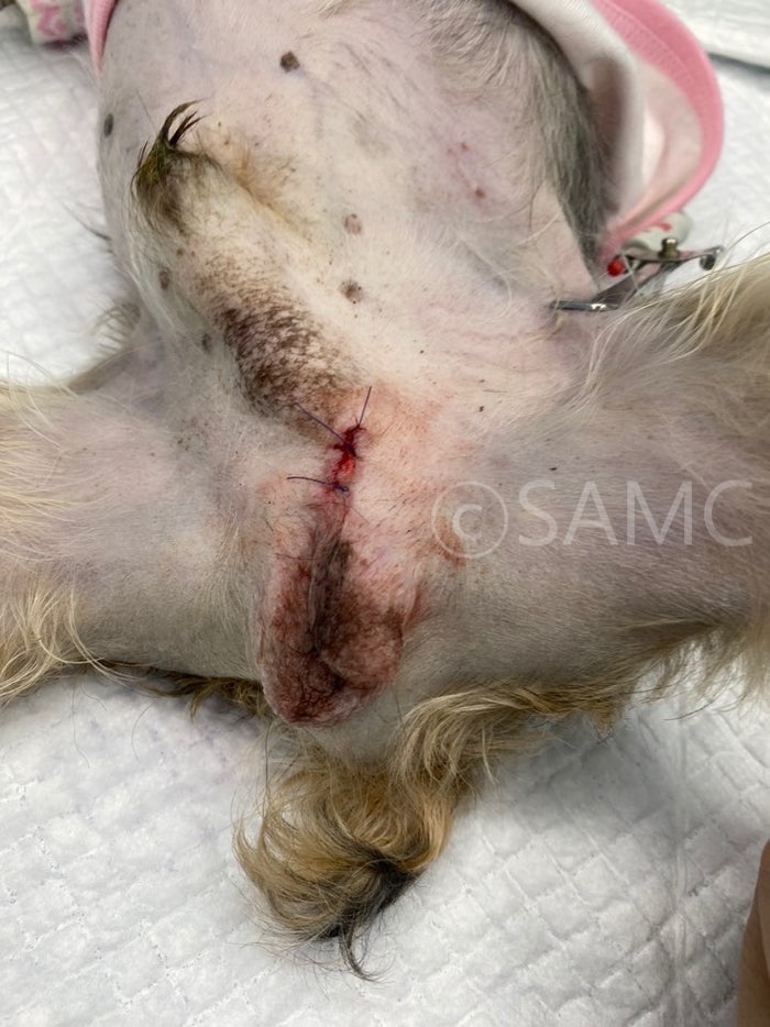 대형견 11세는 소형견보다 노령이라고 할 수 있기 때문에 마취가 안정적인 것을 잘 확인한 후 개복하여 농밀한 자궁과 호르몬을 생성하는 난소를 모두 적출했습니다.