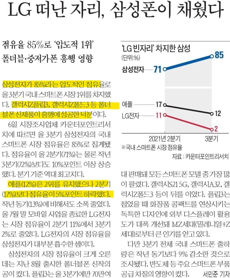 ●LG 이탈, 삼성 점유율 85%로 확대.●한국의 삼성이 압도적 애플은 12%