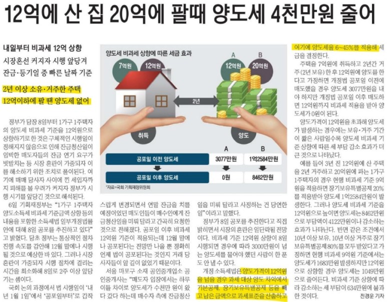 ● 양도세 오늘부터 비과세 12억원으로 상향 조정
