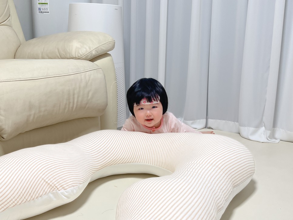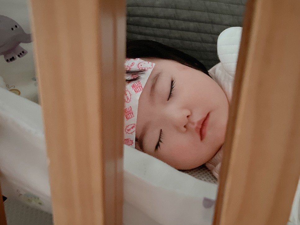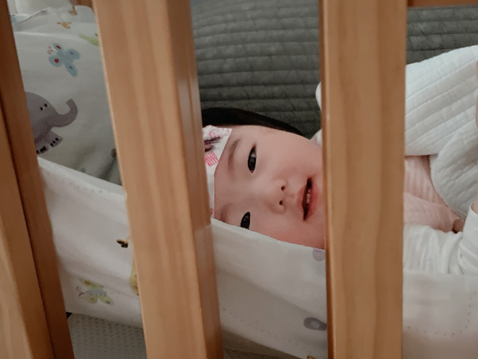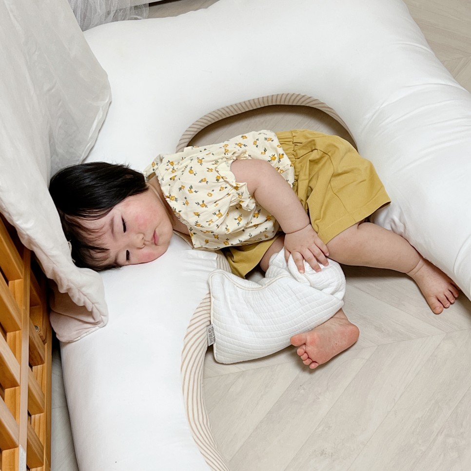 중얼거림, 낮잠, 밤에 잠을 못 자고 놀지도 못하고 거의 침대와 하나가 되었습니다. 울어도 침대에서 울겠지….! 내 방에서 나오기도 싫어서 결국 바디필로우와 담요를 가져가 24시간 붙어있었습니다. 이때 진심으로 아기침대를 나눠 매트를 사고 싶었어요.(웃음)