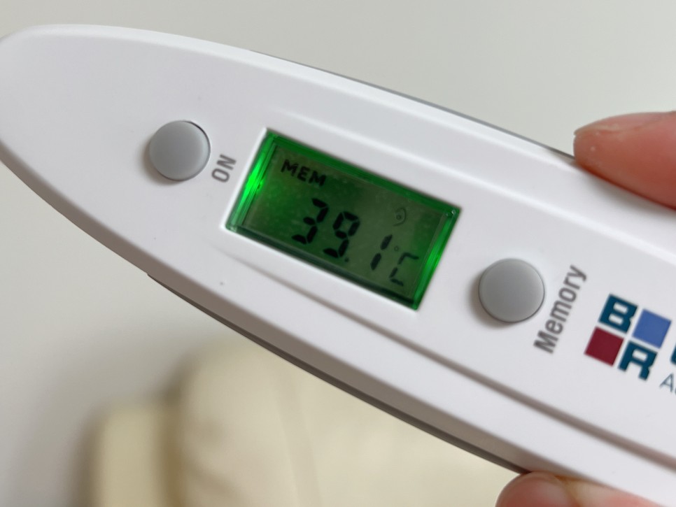 몇시간 정도 지났을까 갑자기 열이 39.1도~40도까지 바짝 올라갔어요.해열제 주사까지 맞았는데 왜 올라가?! 처방받은 해열제 교차 복용을 해도 그때만 롤러코스터처럼 올라갔다 내려갔다 했어요.