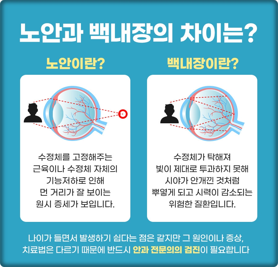 노안과 백내장이 헷갈려 백내장을 노안으로 오해하기도 했어요 백내장은 수정체가 탁해 빛이 제대로 투과하지 못해 시야가 안개에 싸인 것처럼 흐릿하고 시력이 저하되는 질환이었어요. 그러나 단순히 노안만으로 생각하여 백내장이 진행되는 것을 모르기도 했습니다. 백내장은 수술을 통해 일상 생활의 만족도를 높일 수 있었습니다.
