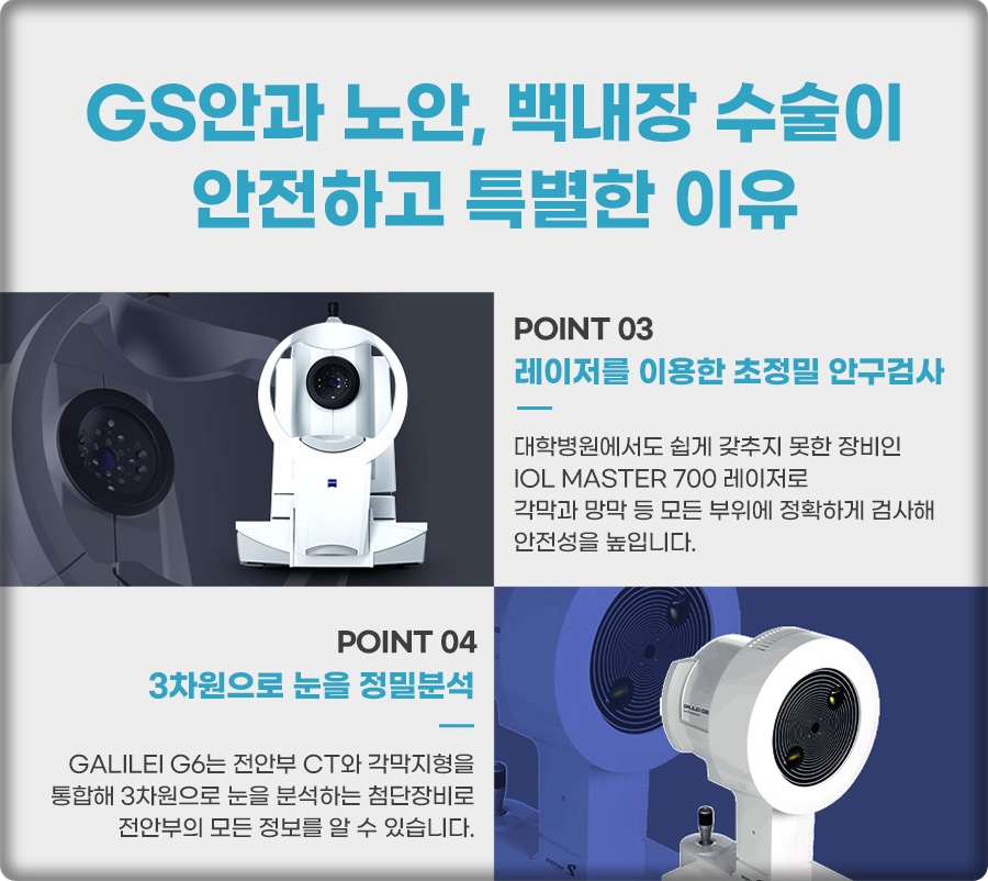 백내장 수술에 대해 알기 전에 백내장이 발생한 눈은 모두 증상의 정도가 같지 않다는 것을 알았습니다. 고객에 따라 눈의 모양과 구조가 다르기 때문에 고객에게 가장 적합한 수술 방법을 선택하는 것이 가장 중요했어요. 다양한 수술방법을 시행할 수 있었습니다. 그러므로 고객의 눈 상태에 맞는 방법의 수술을 통해 양질의 결과를 얻을 수 있었습니다.