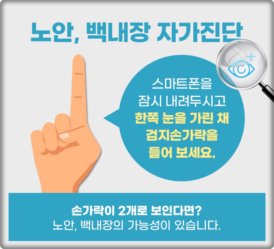 노안과 백내장을 자가진단 해보셨나요? 잠시 한쪽 눈을 가린 상태에서 검지를 들어보세요. 검지 손가락이 2개 보인다면 노안 또는 백내장일 가능성이 있었습니다. 평소와 달리 물건이 두 개 이상 보이거나 초점이 맞지 않았습니다. 눈부시고 빛나는 증상을 느꼈어요. 야간운전이 어려웠고 시력이 오히려 좋아진 것 같았어요. 이러한 증상이 반복된 경우에는 백내장에 대한 정밀 검진이 필요했습니다.