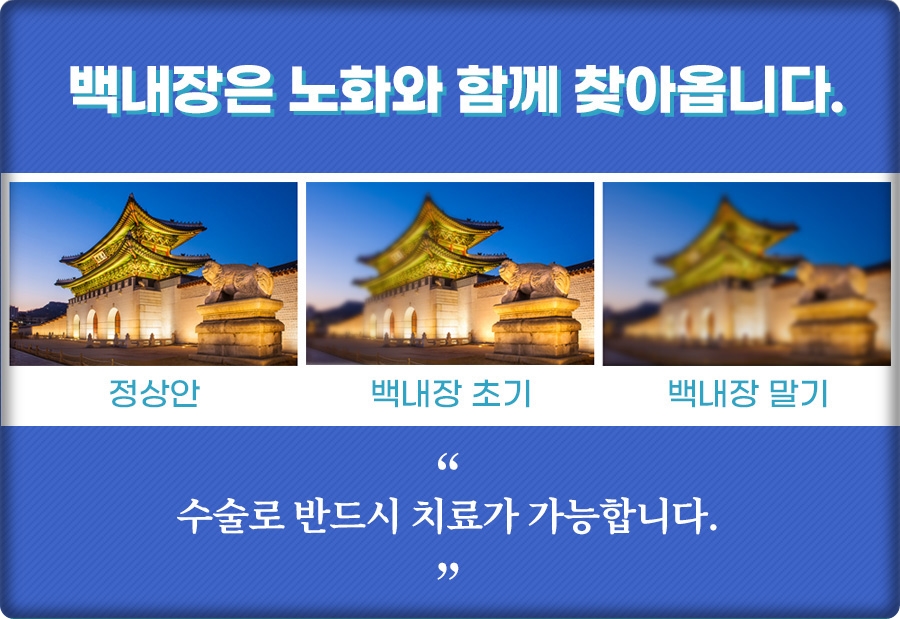백내장은 노화와 함께 생기지만 수술로 치료가 가능한 질환이었어요. 그래서 꼭 수술을 통해서 치료를 해야만 했어요. 수술을 통해 평소 불편했던 시야를 예전처럼 회복할 수 있는 질환이었습니다.