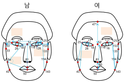 형태변수는 얼굴에 기준점을 설정한 뒤 이를 이용해 길이, 각도, 비율, 면적 등을 추출하고, 색변수는 영역을 구분해 영역별 밝기 성분, 빨간색, 파란색 등의 성분으로 표현되도록 변수를 추출했다.