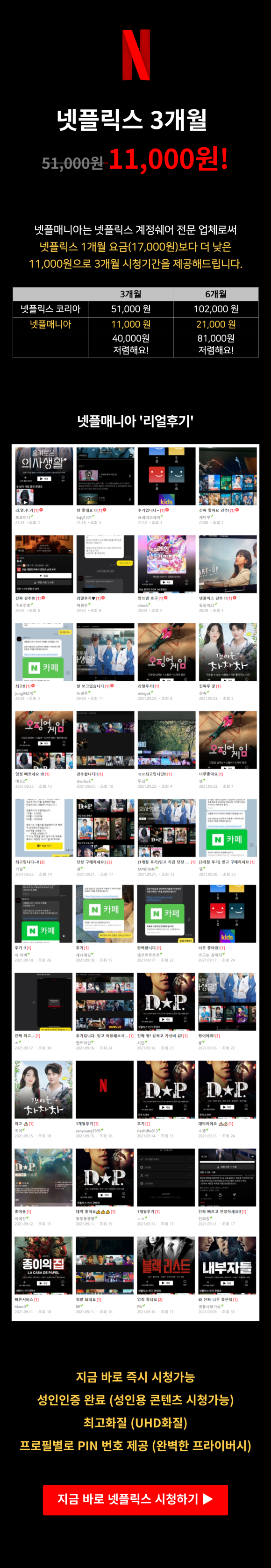 따라서 똑똑한 분들은 같이 시청할 지인을 찾아 4명이 요금을 나눠 즐기는 분들이 정말 많습니다. 넷이서 돈을 나눠서 내면 부담이 없는데 주변 지인들에게 같이 볼 것을 권하고 설득해야 하는 번거로움이 크기 때문에 많은 분들은 혼자만 비용을 내고 시청하는 분들도 꽤 많습니다. 이런 불편한 점을 모두 커버한 것이 바로 넷플릭스 uhd 인터넷 속도 저렴하게 요금제 공유 계정을 공유하고 시청하는 것입니다. 3개월 11,000원이고, 6개월은 21,000원으로 프리미엄 요금제 한 달 가격도 안 되는 금액으로 3개월이나 볼 수 있는 것이 너무나 큰 장점이다. 따라서 이제는 제가 혼자 넷플릭스를 결제하고 같이 볼 지인들을 찾으러 갈 필요 없이 편하게 시청을 원하는 기간만큼 시청했다가 연장해도 되고, 더 이상 보기 싫으면 언제든지 중단해도 되는 시스템이기 때문에 부담이 없습니다.