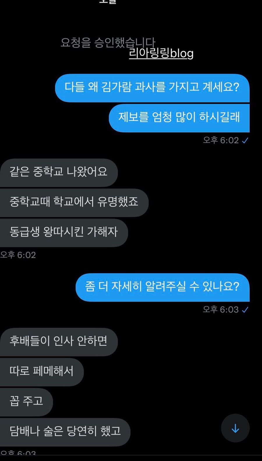 이어 김가람의 중학교 동창이라고 주장한 또 다른 누리꾼은 쟤는 정말 이상한 짓을 했대요. 가벼운 괴롭힘은 물론 옆을 지나가기만 해도 욕을 퍼부었다고 합니다.