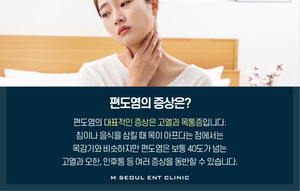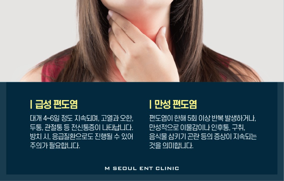 편도염은 ‘급성 편도염’과 ‘만성 편도염’으로 나뉩니다.■급성 편도염ㅣ대략 4~6일 정도 지속되며, 고열과 오한, 두통, 관절통 등의 전신통증이 나타납니다.방치하면 편도 주위 농양, 심경부 감염, 패혈증 등의 응급질환에도 진행될 수 있어 주의가 필요합니까?
