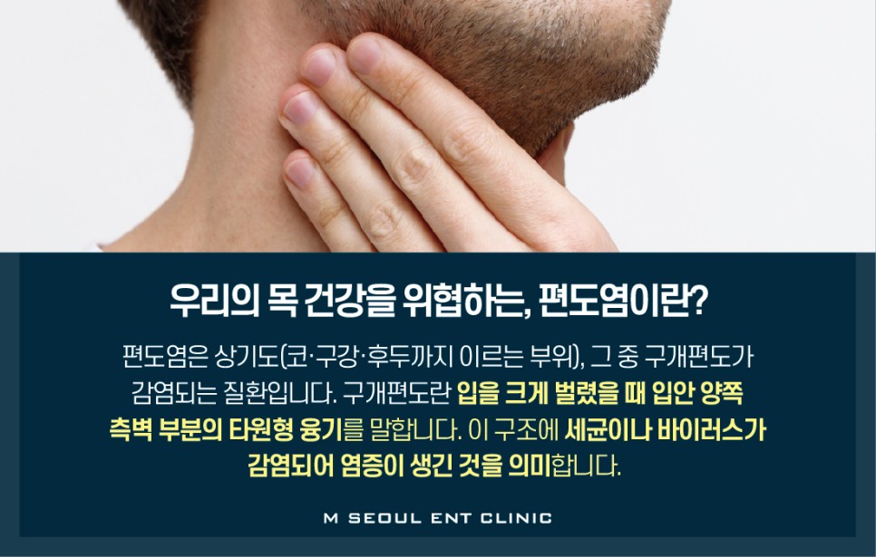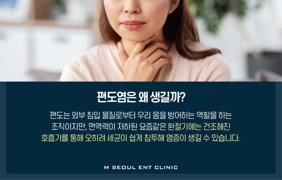 편도염은 ‘왜’ 생길까?편도는 외부 침입물질로부터 우리 몸을 방어하는 역할을 하는 조직인데 면역력이 저하된 요즘 같은 환절기에는 건조한 호흡기를 통해 오히려 세균이 쉽게 침투해 염증이 생길 수 있습니다.