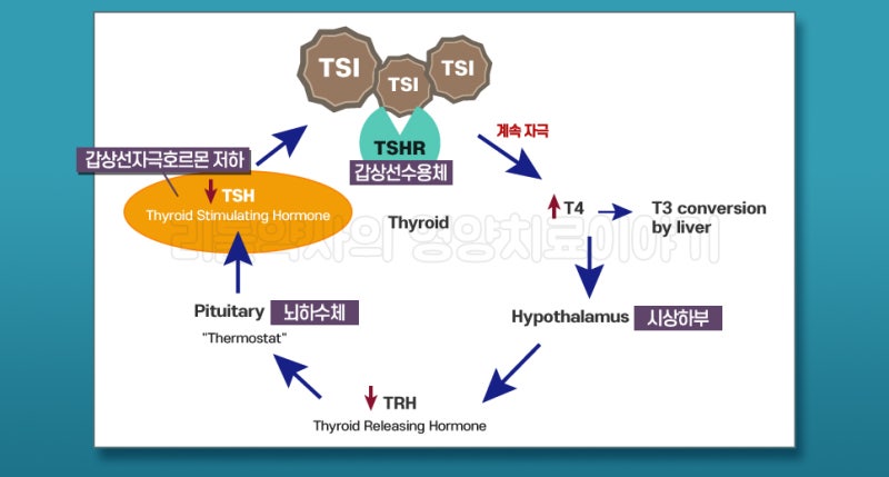 그레이브스병(Graves’disease)이 생기는 주요 메커니즘은 자가면역에 의한 것으로 TSI(Thyroid stimulating immunoglobulin)라는 항체가 핵심적인 역할을 합니다.