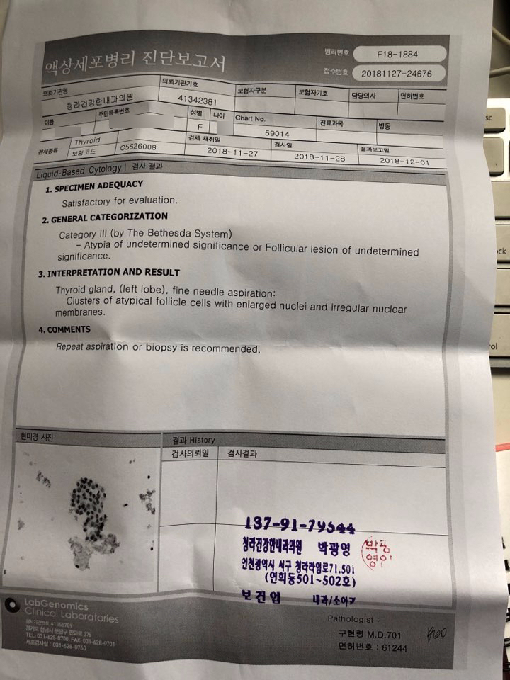 그 당시에는 몰랐지만 갑상샘암이 한동안 큰 화제가 됐다고 한다. 국립암센터에 다니던 친구도 갑상샘암 과잉진료에 관한 논문을 썼다고 한다. 통증이 없어 모르고 지나칠 수 있고 고령에 숨진 사람의 시신에서 갑상샘암이 발견되는 경우도 많을 정도로 치사율이 높지 않은 암. 예후가 좋은 암 외국에서는 수술도 안 하는 암 갑상샘암에도 종류가 3가지 정도 있는데 대부분 유두암일 확률이 많다고 했다. 최근에는 3개월마다 추적검사를 실시해 암이 얼마나 커지는지, 전이되는지에 따라 수술을 결정한다고 한다.
