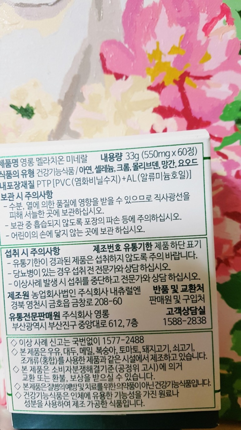 영론 멜라티온 미네랄의 성분을 살펴보니 주원료는 프리미엄 건조 효모로 건조 효모인 (아연, 셀레늄, 크롬, 몰리브덴, 망간, 요오드) 배합으로 6가지 미네랄 보급이 가능합니다.