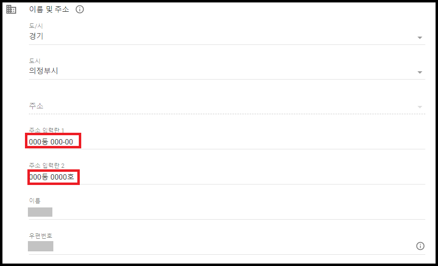 설정 관리/주소를 수정하러 갑니다.아래에 스크롤/이름 및 주소 옆의 연필 버튼을 클릭하여 주소를 수정합니다.주소입력란1:도로명주소나3에서150주소입력란2:아파트동호수세부주소101동1501호주소입력란1(도로명)과주소입력란2(아파트동호수)를 구분하여 씁니다. 저장합니다.