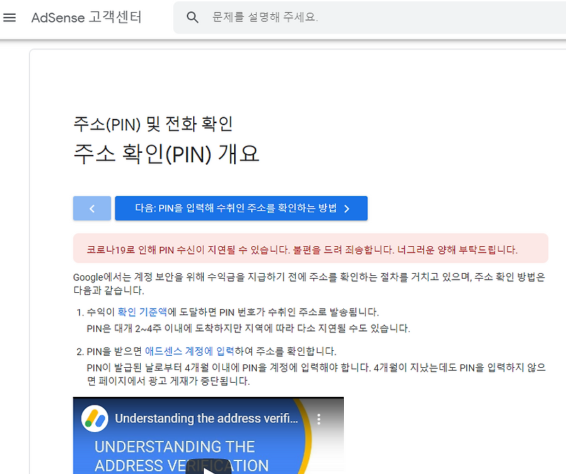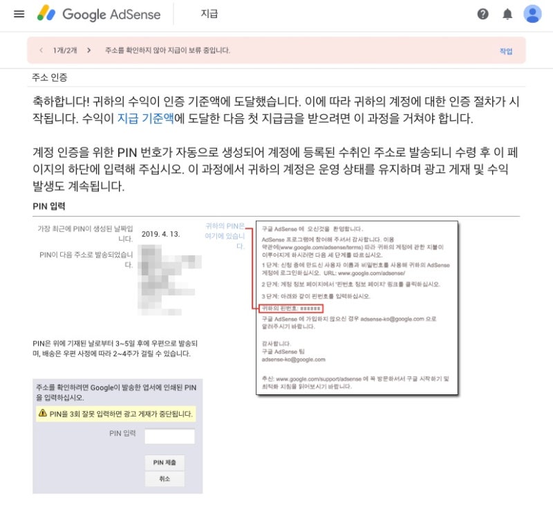 유튜브 수익 창출 | 어드센스 PIN 못 받으면 어떡하지? PIN 재전송 | 주소입력란 1, 주소입력란 2의 차이는?4주가 지나도록 우편으로 PIN 번호를 받지 못한 경우 주소를 확인하시고 PIN 번호를 다시 요청하시기 바랍니다.Google AdSense 사이트에서 접속하여 주소를 확인합니다.