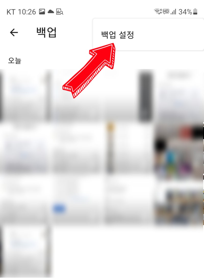2. 아래 팝업창이 뜨면 중간에 위치한 ‘백업중’, ‘백업완료’, ‘와이파이 연결대기중’이라고 표시된 칸을 선택합니다.(빨간 화살표 표시) – WiFi를 사용 중이면 “백업 중”이나 “백업 완료”와 같은 텍스트가 표시되며, WiFi를 사용하지 않은 경우 “WiFi 연결 대기 중” 텍스트가 표시되어 있습니다.