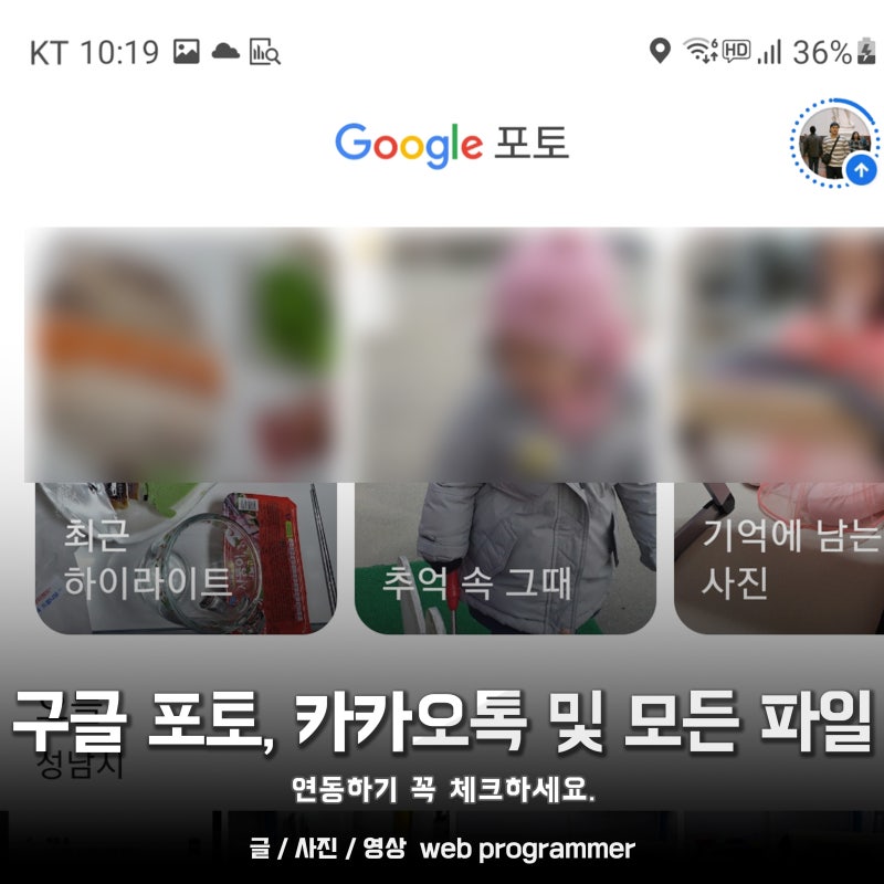 안녕하세요. 오늘은 구글 포토에 대해 이야기하려고 합니다.저처럼 카카오톡으로 가족사진을 주고받는 분들은 사진 백업이 제대로 안 돼서 부족한 스마트폰 용량 때문에 스트레스 받는 분들이 많을 것 같습니다.사실 저도 아이를 키우는 입장이기 때문에 스마트폰 용량에 굉장히 스트레스를 받고 있습니다.사진을 찍고 있으면 128GB, 256GB로도 부족해지니까요.그래서 나는 구글 원 멤버십에 가입해서 구글 포토를 유료로 1년에 2TB를 약 12만원 정도에 구입해서 이용하고 있어요.아내의 휴대폰도 가족에게 초대해서 같이 사용하고 있기 때문에 아이의 사진을 걱정없이 올리고 있습니다.하지만 이렇게 구글 포토를 이용해도 카카오톡 사진은 제대로 백업되지 않습니다.사진을 휴대폰으로 다운받더라도 다른 폴더를 만들어 저장하기 때문에 구글 포토에서 다른 옵션을 활성화해야 합니다.