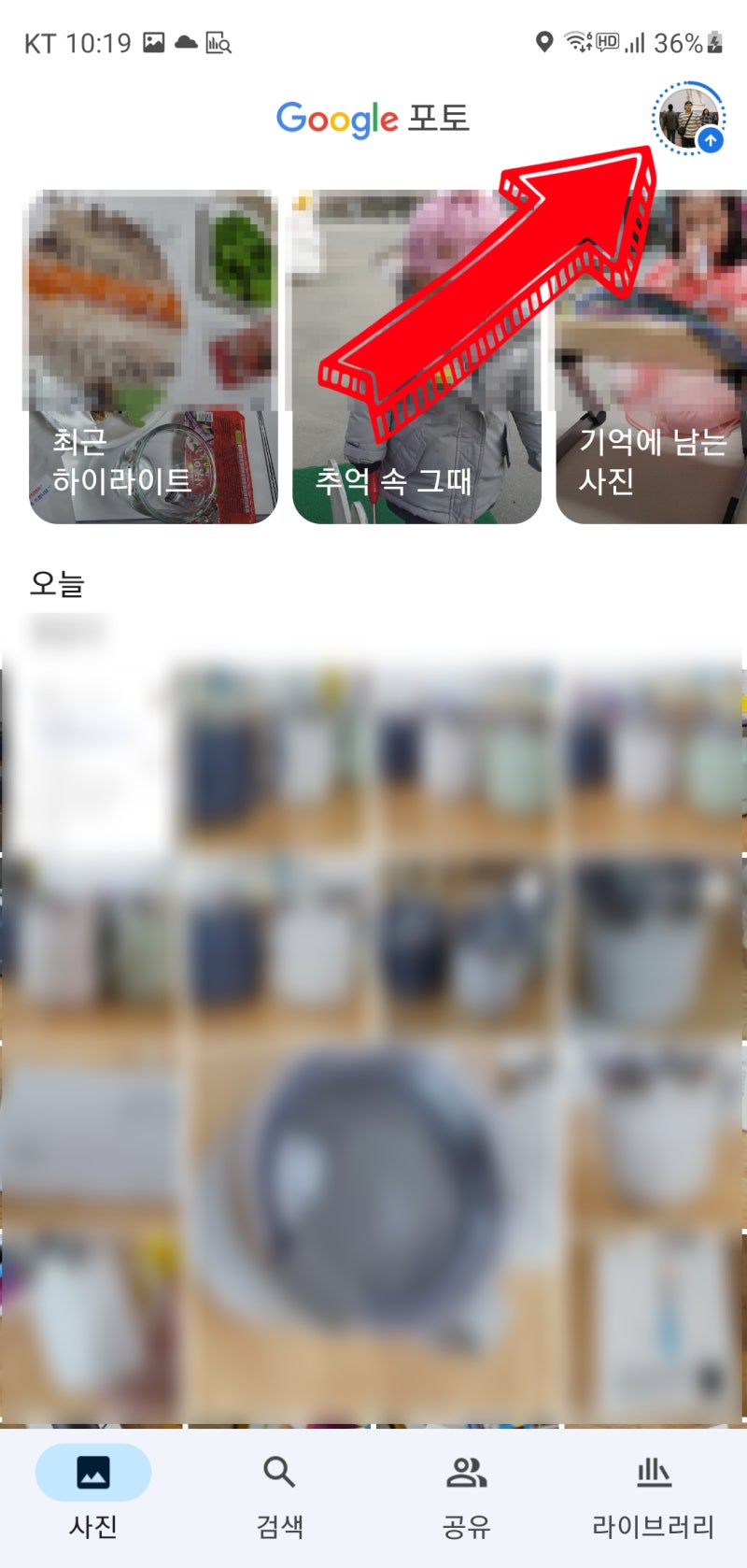 1. 먼저 구글 포토 앱을 실행한 후 우측 상단의 설정 버튼을 선택합니다. (빨간 화살표 표시)