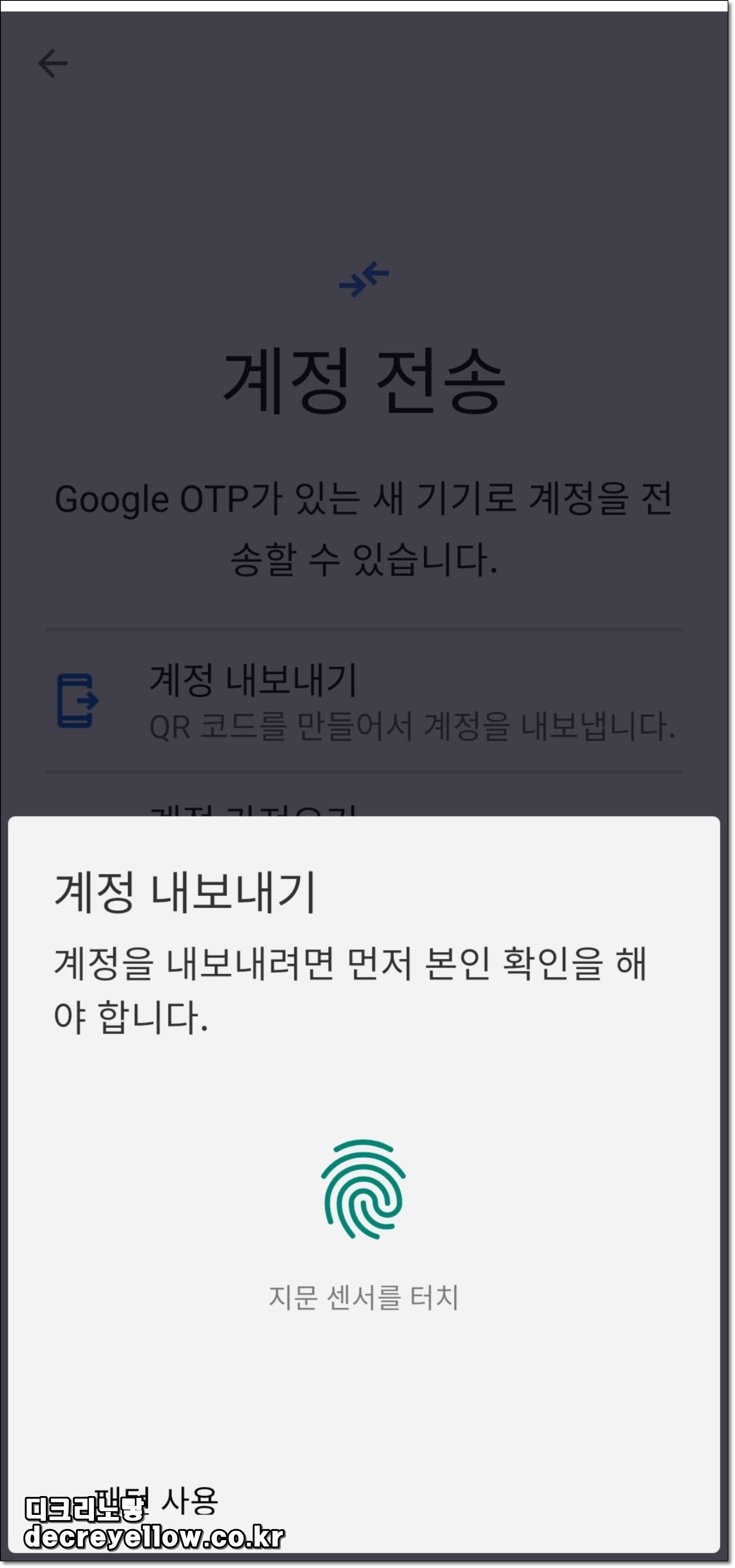 그 방법은 아주 간단하게 5분도 걸리지 않는 기간에 완전히 복사할 수 있습니다. 구글 OTP 화면 오른쪽 상단의 3점을 누릅니다.
