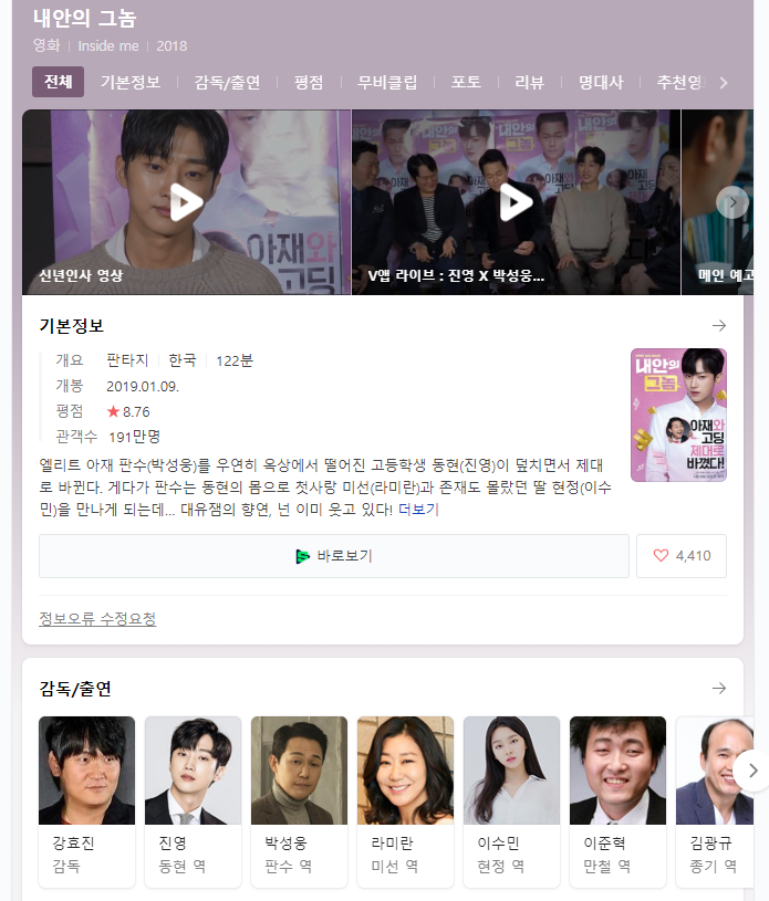 제 안의 그놈의 출연자로는 박성웅, 라미란, 이수민, 진영을 주연으로 이준혁, 김광규 등 개성파 조연들이 영화에 대한 기대감을 높여주었습니다.특히 과거 레인보우 출신 조현영의 영화 데뷔작이라 주목받기도 했습니다.줄거리의 경우 진부하고 뻔하다는 평가를 하시는 분들도 많이 계시는데 제 생각에는 그 정반대로 진지하게 FUN이라고 표현해도 좋을 정도로 만족스러웠습니다.정말 아무 생각 없이 기분전환용 영화를 찾으시는 분들께 추천드립니다.