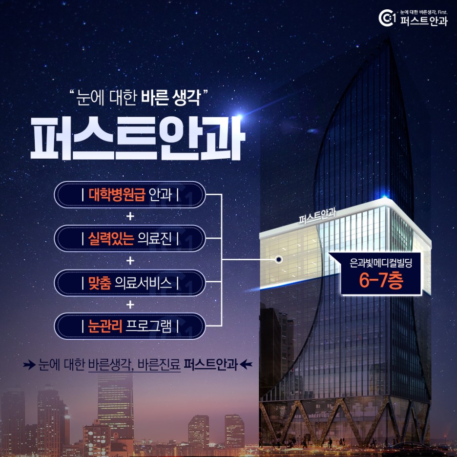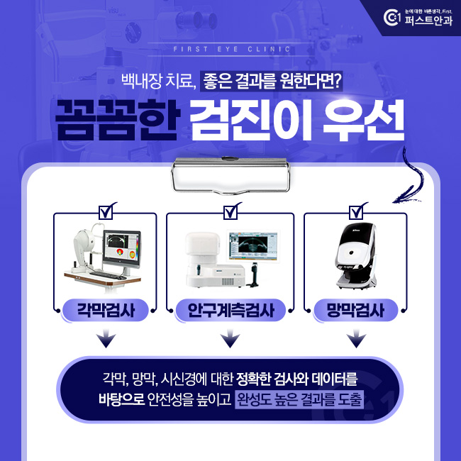 50여종의 검사장비를 갖춘 이 퍼스트에서는 각막검사와 안구계측검사, 망막검사 등 다양한 과제를 거쳐 객관적인 진단과 안과 전문의 상담으로 개인별 맞춤치료를 제공하고 있습니다.