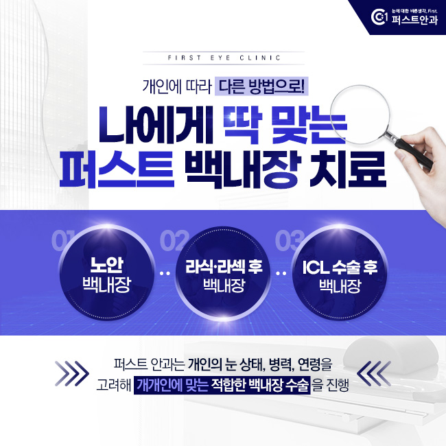 혼탁한 수정체에 의한 부산 백내장 수술뿐만 아니라 노안 교정과 라식, 라섹 수술 후 치료, ICL 렌즈 삽입술 후 치료 등 다양한 방법의 치료를 제공하고 있습니다.