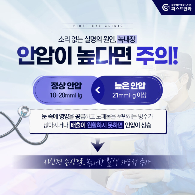 - 2) 안구압력 고안압 녹내장 – 안구의 압력이 정상적인 범위보다 높고 진행속도가 빠릅니다.정상 안압 녹내장 – 안압은 정상이나 다른 원인에 의해 시신경이 손상되어 발생합니다.