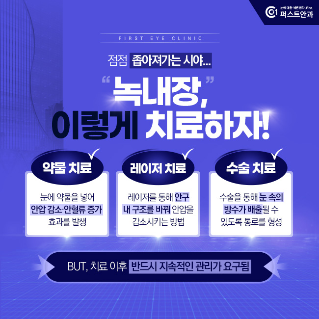 녹내장 증상 안압 상승으로 인한 두통 발생 시야가 대체로 흐릿하고 시야가 대체로 좁아지는 현상 발생