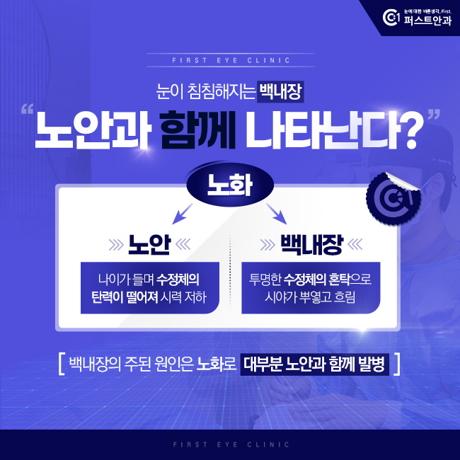 노화에 의해 눈이 침침해지는 것을 백내장이라고 단정할 수는 없습니다. 노안은 나이가 들면서 수정체의 탄력이 떨어져 시력이 저하되는 자연스러운 현상이라고 할 수 있지만 백내장은 투명한 수정체의 혼탁으로 인해 시야가 뿌옇게 흐려 보여 확연히 차이가 있습니다.