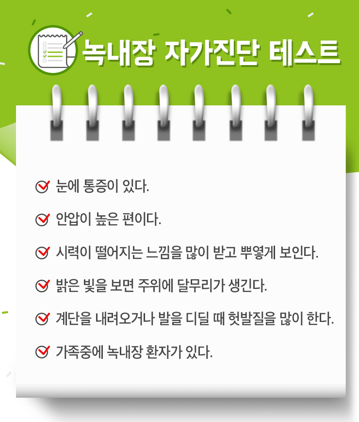 다만 건강검진에서 녹내장 의심 소견을 보이거나 고도 근시를 갖고 있거나 오랫동안 당뇨와 고혈압을 앓고 있다면 다른 사람에 비해 발병률이 높으므로 검사를 받는 것이 좋습니다.