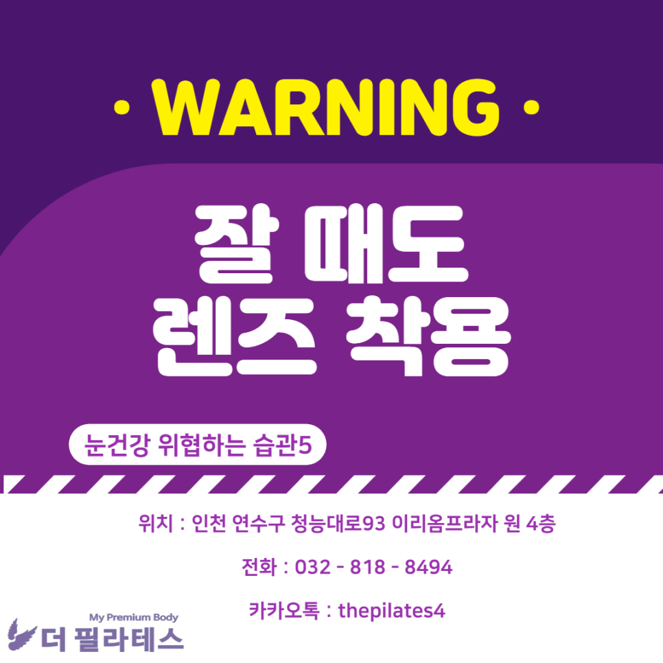 수분을 마시는 렌즈의 특성상 착용 시간이 길어지면 안구건조증으로 눈도 딱딱해집니다.특히 자는 동안 콘택트렌즈를 착용하면 각막 표면의 세포재생이 정상적으로 이루어지지 않아 감염에 더욱 취약해집니다.잘 때 렌즈를 끼면 각막염 발생이 5배나 증가한다고 하니 송도 필라테스 다필라티스 회원님은 아무리 피곤해도 자기 전에 반드시 렌즈를 벗긴다!