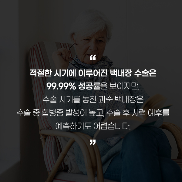 혼탁해진 기존 수정체를 제거한 뒤 수정체 후낭 안에 인공수정체 렌즈를 삽입하는 과정에서 이뤄지는 수술은 백내장이 심해지면 수술이 어려워져 더욱 어려워집니다.환자에 따라 진행 속도와 혼탁 정도, 일상생활의 불편함 등이 다르므로 꼼꼼히 파악하여 적기에 수술하는 것이 좋습니다.