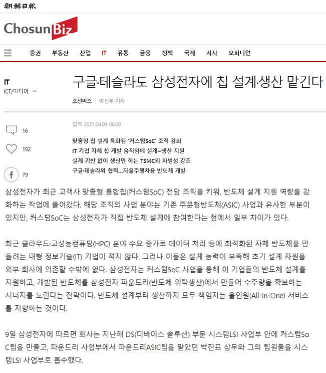 기사출처 : 조신비즈 박진우 기사상세 : 맞춤형 칩 설계에 특화된 ‘커스텀 SoC’ 조직 강화 IT업체 자체 칩 개발 움직임에 설계~생산 지원 설계 기반 없이 생산만 하는 TSMC와의 차별성..’biz.chosun.com 삼성전자가 구글의 자율주행차 ‘웨이모’에 자율주행차용 칩을 공급하기로 했다는 기사입니다.
