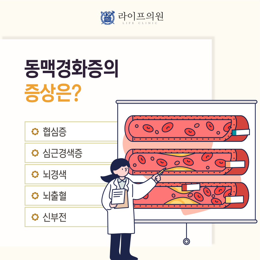동맥경화증의 증상 동맥경화증이 어느 혈관에서 발생했는지에 따라 다양한 혈관질환이 생깁니다. 만약 심장에 혈액을 공급하는 관상동맥에 문제가 생기면 협심증이나 심근경색 같은 허혈성 심장질환이 생기고 뇌로 흐르는 혈관에 문제가 생기면 뇌경색, 뇌출혈 등 중뇌졸중이 발생할 것입니다. 이외에도 신장의 동맥경화는 신부전을 만들어 장이나 사지 동맥에 동맥경화가 발생하면 장괴사나 허혈성 사지 질환이 발생합니다. 이렇게위험한병을만드는동맥경화는발생하지않는것이제일좋고,그다음에동맥경화반이생겨도빨리진단을하고늦지않도록치료를시작하는것이중요하겠죠?