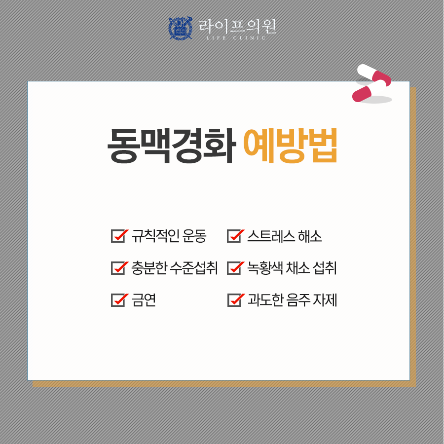동맥경화 예방법 동맥경화를 예방하기 위해서는 규칙적으로 운동하는 것이 매우 중요합니다 일주일에 4일 이상, 1일 40분 이상, 맥박 120회는 운동하는 것이 좋습니다. 충분한 수분 섭취를 함께 할 것을 권합니다. 고혈압, 당뇨, 고지혈증을 치료하고 담배는 반드시 끊을 것, 스트레스를 조절하는 것도 중요합니다. 과음을 자제하고 지방이 많은 육식보다는 생선을 섭취하여 항산화 기능이 있는 야채를 충분히 먹도록 합니다. 무, 배추, 브로콜리 등 유채, 강황, 생강, 양파, 그리고 녹황색 야채를 좋아합니다. 비만도 동맥 경화와 관련이 있기 때문에 적절한 체중 조절도 필요합니다.