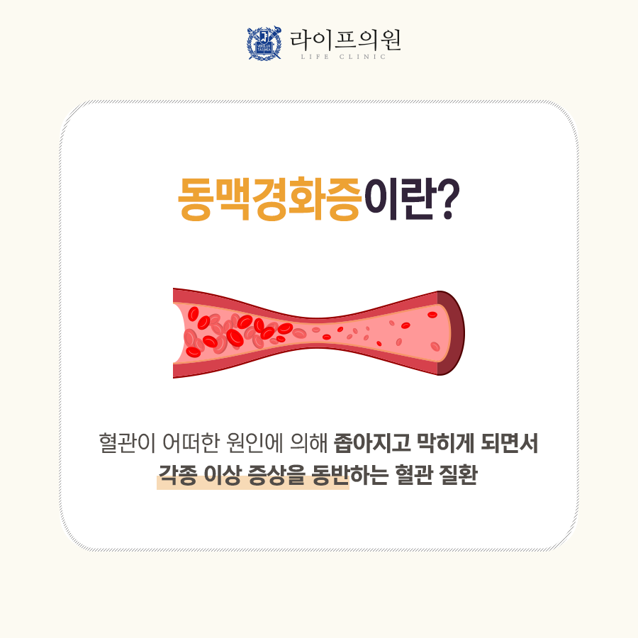 동맥경화증이란? 동맥경화증이란 동맥혈관이 여러가지 원인에 의하여 좁아지거나 막혀서 각종 2차질환을 초래하는 혈관질환입니다. 동맥 내에서 이상이 생긴 부위를 경화반이라고 하는데, 이곳의 혈관 내막 아래에서는 콜레스테롤이 침착하여 세포 증식이 일어나 죽 모양의 죽종이 형성됩니다. 이러한 죽종(atheroma)의 내부는 얇고 그 주변은 단단한 섬유성 막으로 둘러싸여 있는데 경화반이 불안정해지면 이 막이 파열되며 이때 혈관내에 혈전이 생깁니다. 이 혈전이 그 자리의 혈관을 막거나 떨어져 좁은 말초 동맥을 막으면 뇌경색과 같은 색전증이 될 거예요. 죽종(atheroma)내에 출혈이 발생할 수 있는데, 이때는 혈관의 지름이 급격히 좁아져 혈관을 막고 혈액순환을 차단합니다. 혈액순환이 막히면 목숨을 잃거나 심각한 후유증을 일으키기 때문에 동맥경화증에 대한 경각심을 갖고 예방에 주의하고 조기에 발견하여 조기 치료하는 것이 중요합니다.