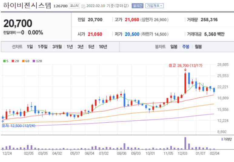 하이비젼 시스템은 202 1년 12월에 신고가를 돌파해, 2개까지 급등하는 모습을 보인 후, 시장의 급락+조정을 거치고 있습니다.