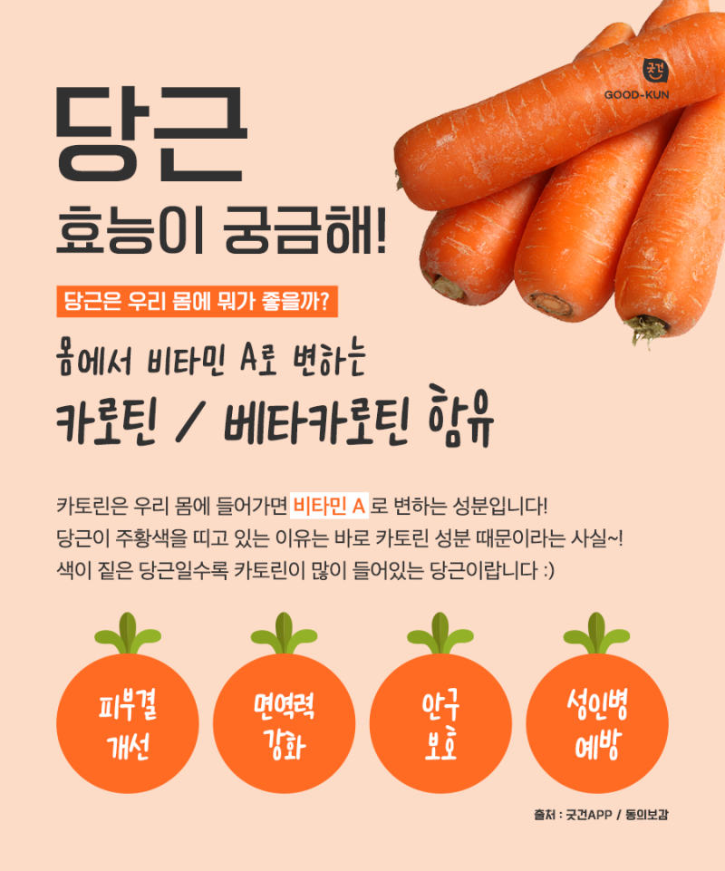 당근효능 🙂 면역력 건강에 좋대요! 당근에는 비타민A가 들어있어 바이러스를 막는 효과가 있어요. 면역세포 생성까지 해주기 때문에 요즘 감기 걱정이 되지만 도움이 된다고 합니다. ^^ 당근 효능:) 성인병 예방에도 도움이 됩니다! 당근은 원기회복에 좋아 만성피로에 효과적입니다.또 콜레스테롤을 낮추면서 당뇨&고혈압 등에도 좋대요!