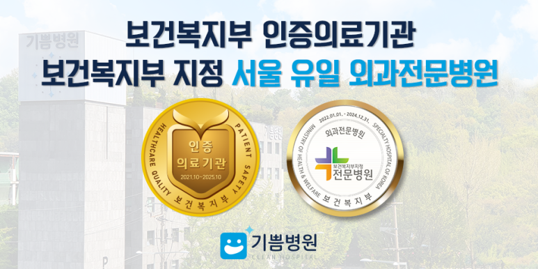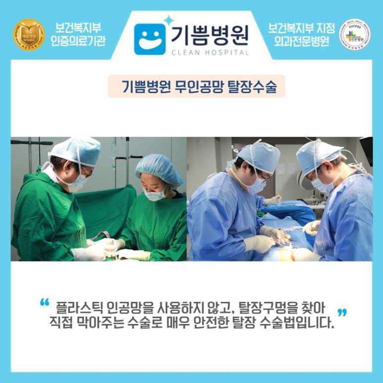 기쁨병원은 당일 입원 및 당일 퇴원이 가능하며 안전한 탈장수술로 환자의 만족도가 매우 높습니다. 탈장이 의심되는 경우 기쁨병원에 내원하여 진단을 받으시기 바랍니다.<내용 검토 및 검수의료진>