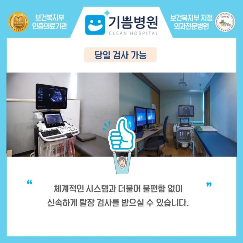 기쁨병원은 당일 검사 및 당일 입원이 가능합니다. 그 이유는 최고급 초음파 검사 장비가 다수 구축돼 있어 체계적인 시스템과 함께 불편함 없이 신속하게 탈장 검사를 받을 수 있기 때문입니다.탈장 전문의 상주