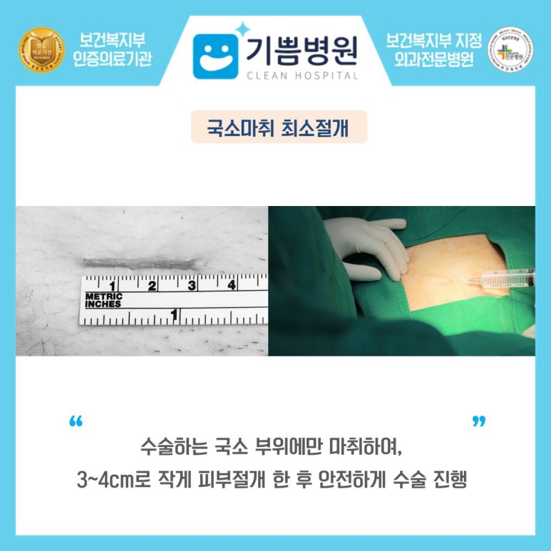 기쁨병원의 무인공망 탈장수술은 인공망을 전혀 사용하지 않고 탈장을 발생시킨 손상된 구조를 본래 정상구조에 가장 가깝게 복원하는 매우 자연스러운 수술입니다. 3~4CM 최소 절개로 탈장의 원인이 되는 구멍을 직접 꿰매 봉합하여 막는 수술을 시행하므로 수술 후 무리가 생기지 않고 거의 없는 재발률을 자랑합니다. 또한 며칠간 입원이 필요하고 수술 전 마취위험도 평가가 필요한 전신마취와 달리 기쁨병원의 무인공망탈장수술은 수술할 국소부위에만 마취하며 기저질환이 있는 분을 포함한 남녀노소 모두 안전한 수술이 가능합니다. 국소 부위에만 마취함으로써 회복이 매우 빠르고 당일 퇴원이 가능합니다.