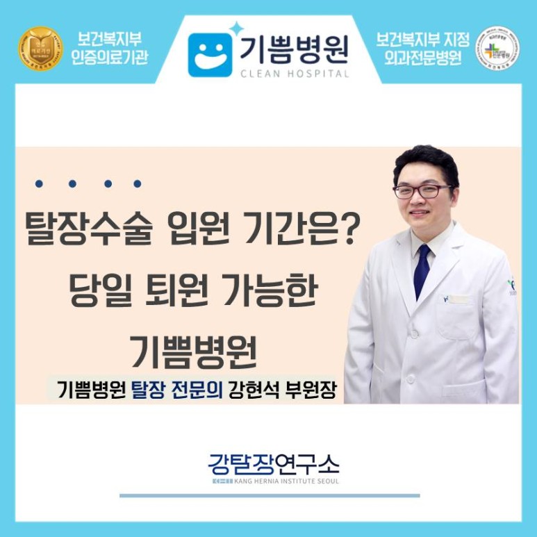 탈장 수술의 입원과 퇴원 기간은 병원에 따라 다릅니다. 하지만 기쁨병원은 입원수술 및 퇴원까지 단 하루 만에 모두 가능합니다.(단 70세 이상인 분과 탈장이 매우 심한 경우 1박이 필요할 수 있습니다.) 오늘은 당일 퇴원할 수 있는 기쁨병원 탈장수술에 대해 알아보겠습니다.당일 검사 가능