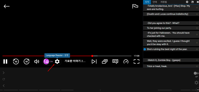 간단한 설정의 경우, (자막크기, 동시자막순서 등) 옆의 톱니바퀴를 클릭하십시오. 또 LR이라는 로고가 on으로 되어있는데 on이 되는 순간 계속 이 화면이 나타납니다.그래서 친구들과 함께 영화를 보거나 할 때 굳이 이런 UI가 필요 없기 때문에 단순 시청을 위해서는 OFF로 클릭만 해도 해당 스크립트나 설정 등이 사라지기 때문에 걱정하지 않으셔도 됩니다.