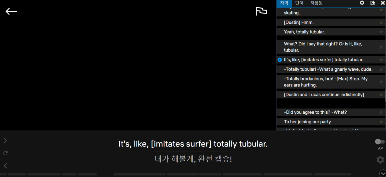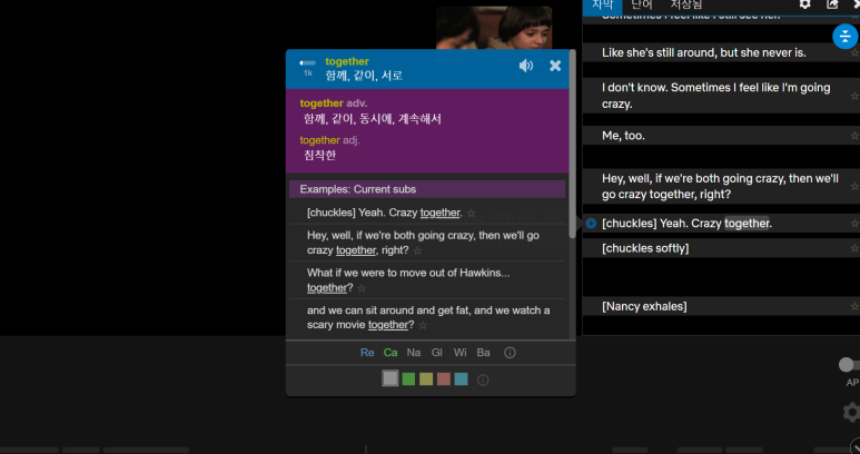 기존의 넷플릭스는 동시 자막을 지원하지 않기 때문에 이러한 웹 확장 프로그램을 사용합니다. 또 오른쪽을 보면 AP라고 되어 있는데 한 자막의 음성이 끝나면 자동으로 돌아가서 무한 반복하는 시스템도 있습니다.모르는 단어를 클릭하면 의미와 예까지 볼 수 있으니 더 좋네요.