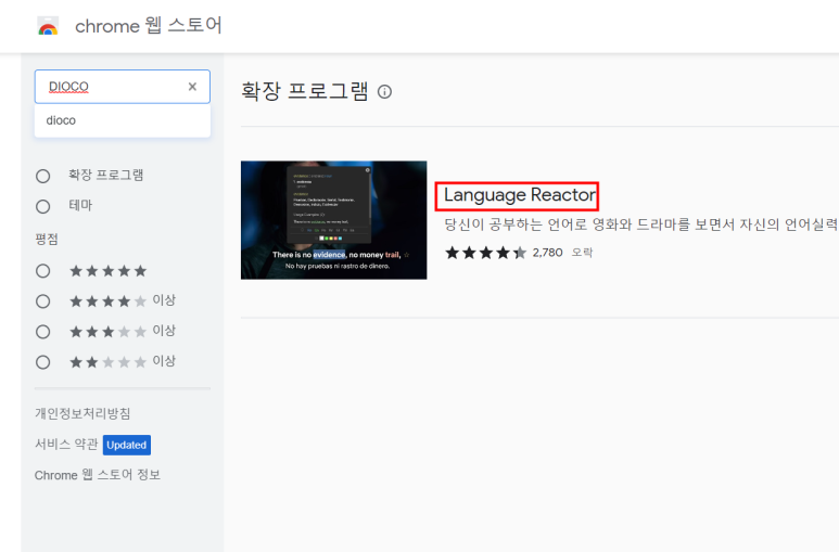 그래서 더 찾아봤어요 이제 이렇게 정보를 공유하게 되었습니다.2. DIOCO 또는 Language Reactor 검색은 일반적으로 넷플릭스 스크립트를 함께 입력하면 잘 나오지 않습니다. 이 앱이 최고야.