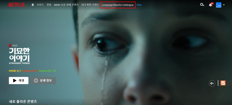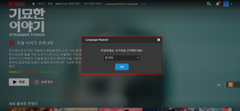 그러면 상단에 Language Reactor라는 메뉴가 나옵니다. 크게 설정할 필요는 없으니 바로 어떤 영화에 들어가야 해요. (feat. 기묘한 이야기는 IMDB8.7에 로튼토마토 91%죠.이런 드라마 영화는 한번쯤은 보는데~~)