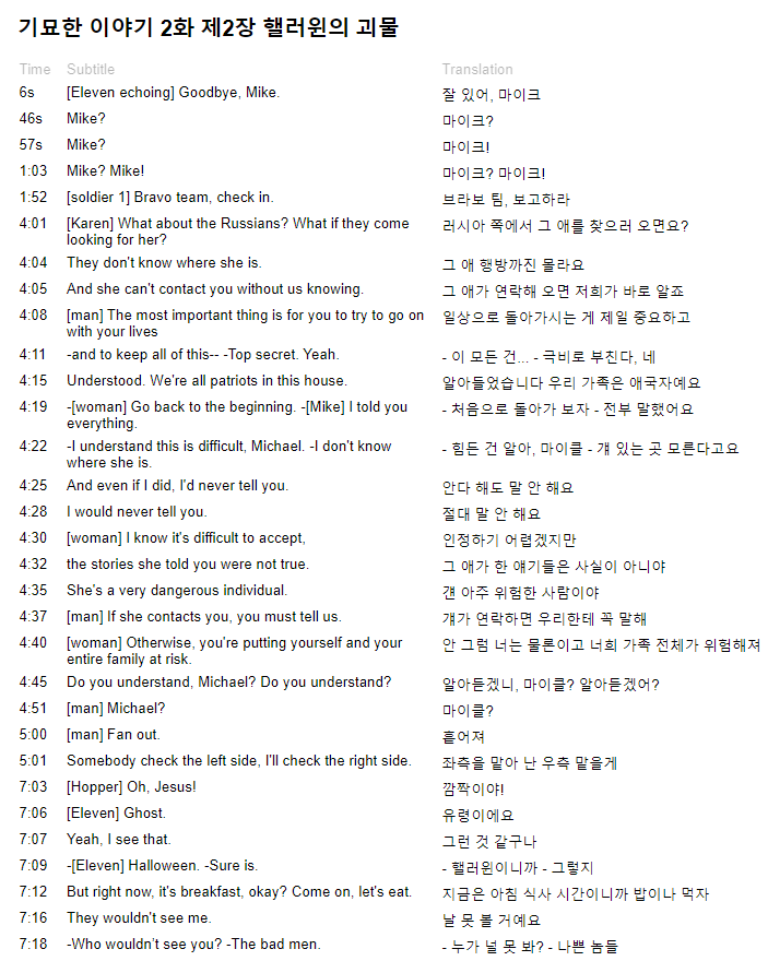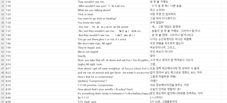 스크립트를 다운받으면 시간, 대사, 한글 대사까지 나오기 때문에 더 보기 편합니다.물론 영어만 나오게 다운받을 수 있습니다.