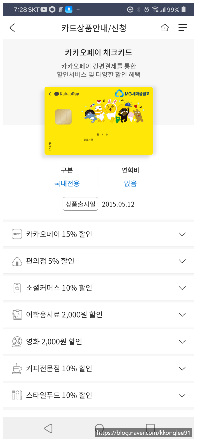 예전에 새마을금고에 카카오프렌즈 체크카드도 혜택이 많아 자주 사용했지만 지금은 유효기간 만료로 사용할 수 없게 돼 아쉬웠다. 이번에 새마을금고 크루체크카드도 나름대로는 나에게 맞는 많은 할인이 있을 것으로 생각했다. 작은 할인이라도 많이 받게 될 줄 알면 괜히 깁니가 좋아 ㅎㅎ 이번달부터는 열심히 실적을 쌓아야지.