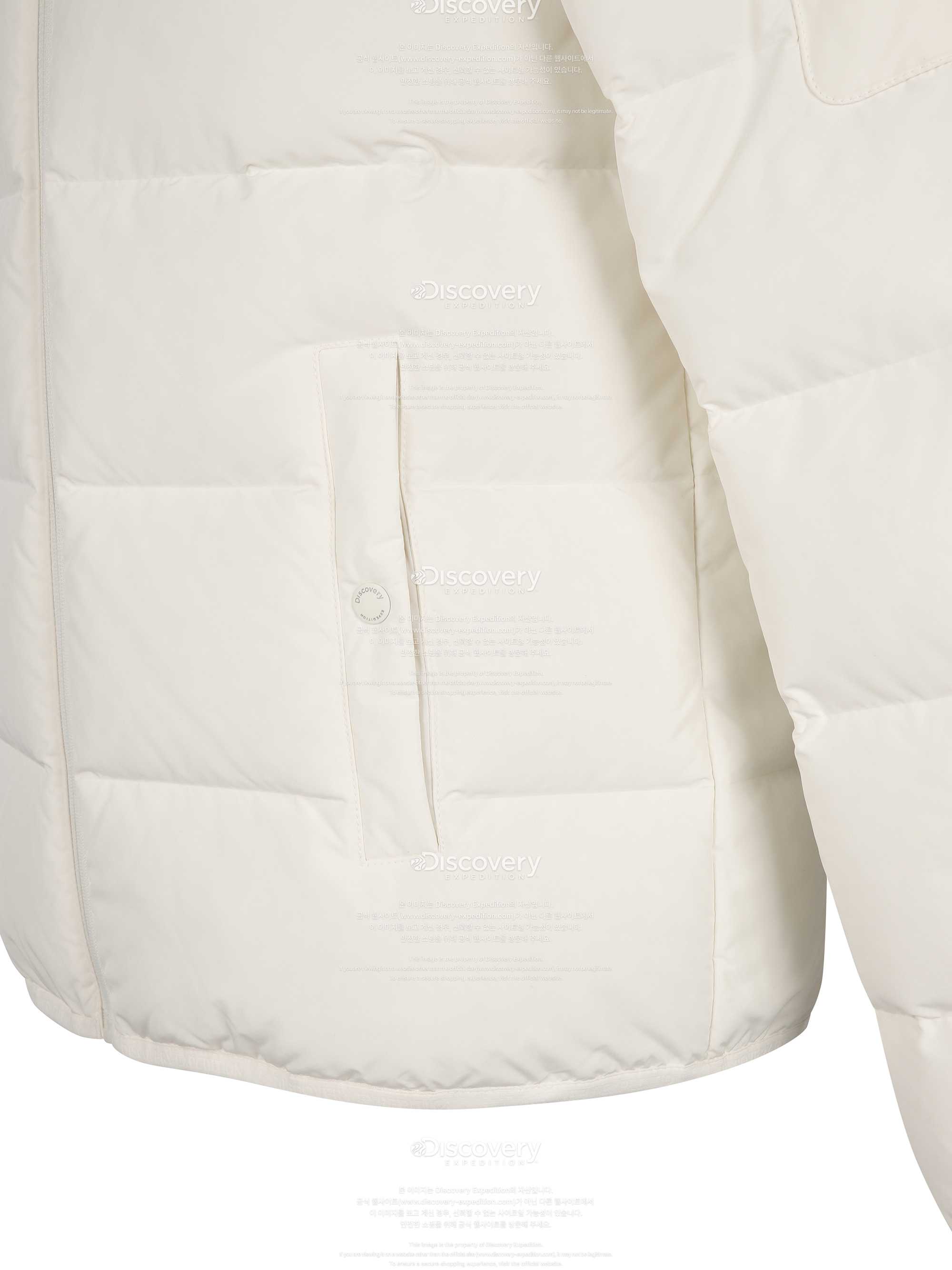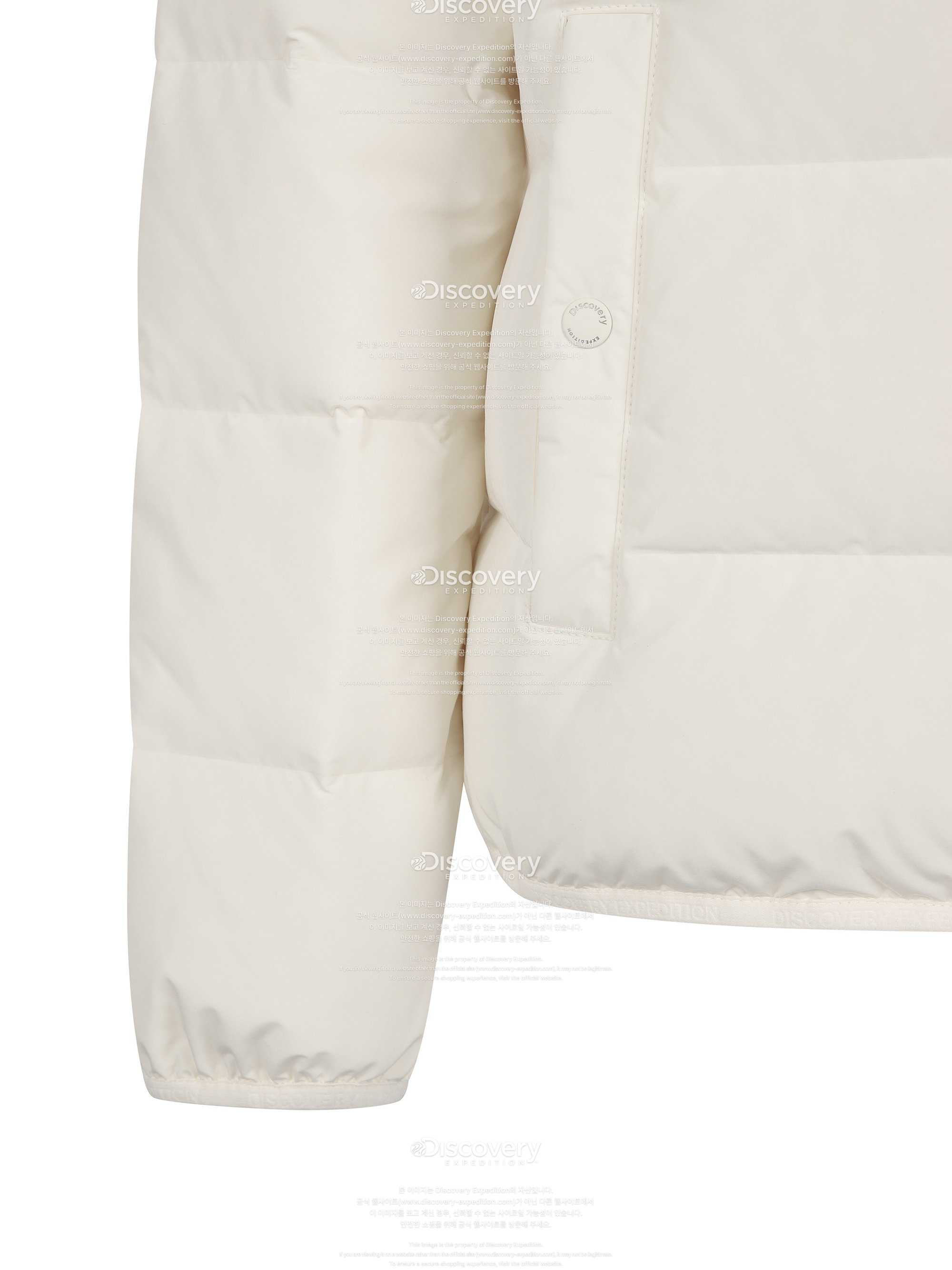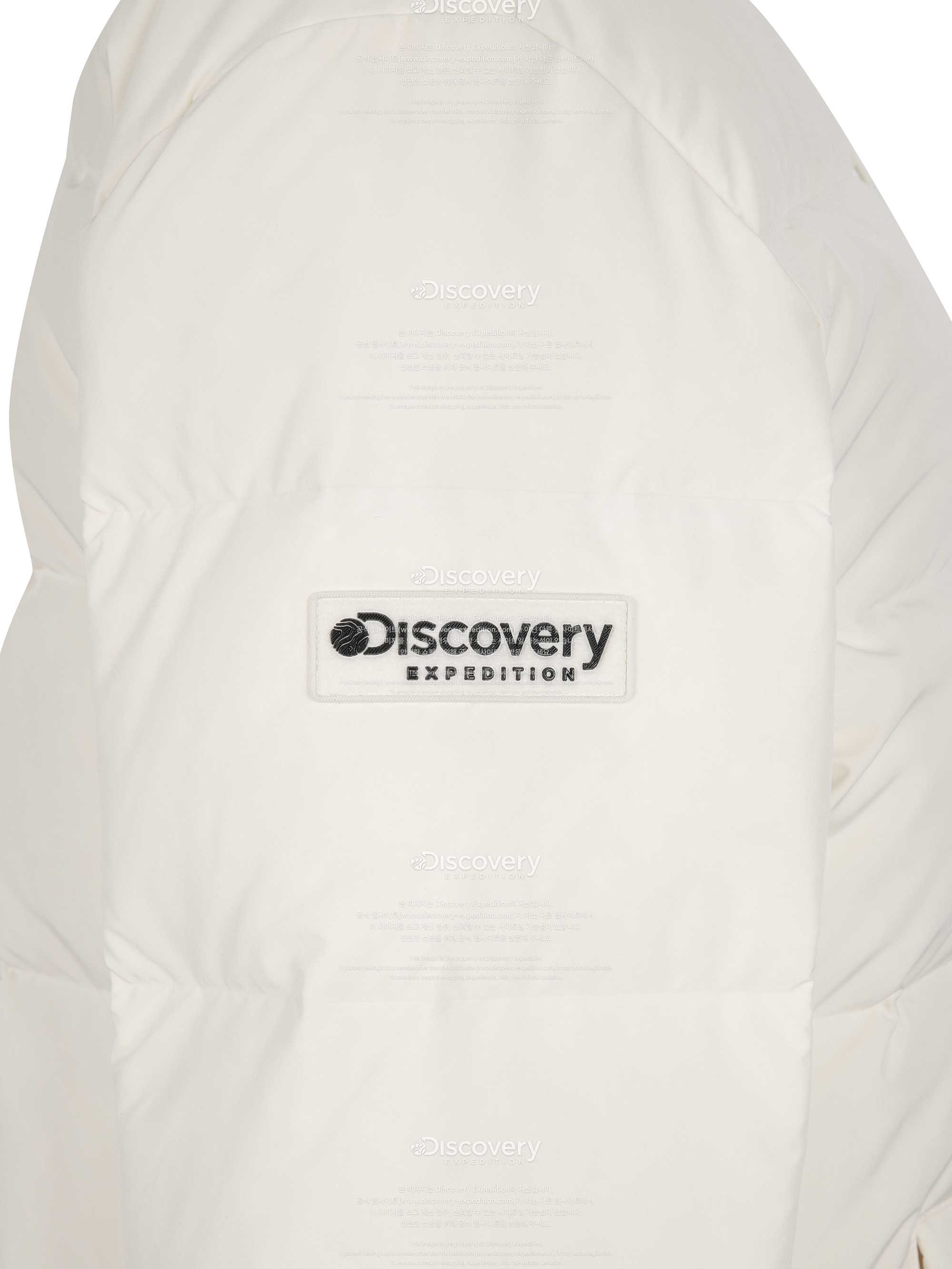 왼쪽 소매 쪽에는 프리미엄 크레스트 심볼 와펜이 부착된 아웃 포켓이 있고 오른쪽에는 디스커버리 사각 로고 와펜이 부착되어 화이트의 깔끔한 색감 속에서 스타일리쉬한 포인트를 주었습니다.무광의 부드러운 촉감의 스냅버튼에도 디스커버리 로고로 완성도가 있어 고급스럽습니다.